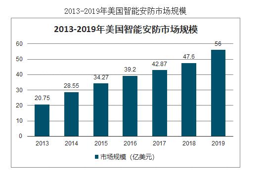 2018年,美國(guó)安防行業(yè)收入達(dá)到952億美元,而美國(guó)智能安防的市場(chǎng)滲透率約為5%。2018年美國(guó)智能安防行業(yè)規(guī)模為47.6億美元。2013-2018年美國(guó)智能安防行業(yè)規(guī)模年復(fù)合增長(zhǎng)率達(dá)到18%, 2019年美國(guó)智能安防行業(yè)市場(chǎng)規(guī)模約為56億美元。