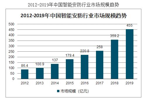 2018年我國(guó)安防行業(yè)總產(chǎn)值為7183億元,目前我國(guó)智能安防滲透率約為5%, 2018年我國(guó)智能安防市場(chǎng)規(guī)模為359.2億元。2012-2018年市場(chǎng)規(guī)模年復(fù)合增長(zhǎng)率高達(dá)26.8%,2019年我國(guó)智能安防市場(chǎng)規(guī)模約為455億元。