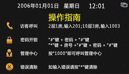 1) 門口機(jī)待機(jī)時(shí)的主界面,包括時(shí)間日期顯示,網(wǎng)絡(luò)是否在線,訪客呼叫、密碼開(kāi)鎖、呼叫中心以及使用說(shuō)明,如圖3.1.1: