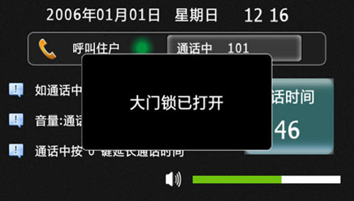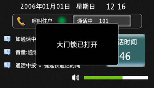 6) 呼叫業(yè)主或和業(yè)主通話時(shí),業(yè)主通過(guò)室內(nèi)機(jī)遠(yuǎn)程開(kāi)鎖,門口機(jī)將顯示“大門鎖已打開(kāi)”如下圖3.2.5: