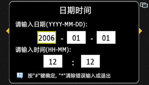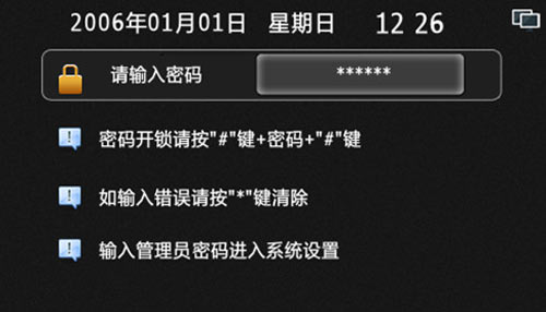 1) 設(shè)置機(jī)器的時(shí)間和日期,如果設(shè)置時(shí)間不合理,則會(huì)提示設(shè)置失敗。設(shè)備開(kāi)機(jī)或運(yùn)行時(shí)會(huì)自動(dòng)同步物業(yè)中心軟件的時(shí)間。格式為安居樂(lè)X-XX-XX XX:XX,例如2006-1-1 12:00,“*”鍵可清除錯(cuò)誤輸入,“#”確定保存并退出,設(shè)置界面如圖4.10.1:
