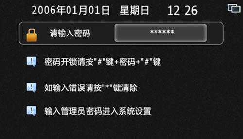 3) 住戶密碼開(kāi)鎖。默認(rèn)為禁用,需物業(yè)人員通過(guò)工程設(shè)置開(kāi)啟權(quán)限才能使用,并且用戶的開(kāi)鎖密碼默認(rèn)為無(wú),需在室內(nèi)機(jī)上設(shè)置才能使用。操作方法:“*”+房號(hào)+“#”+“住戶開(kāi)鎖密碼”+“#”,例如101住戶的開(kāi)鎖密碼為123456,則輸入“*”+101+“#”+123456+“#”即可打開(kāi)單元門。如圖3.3.3:
