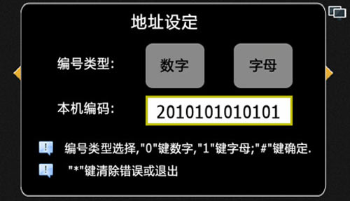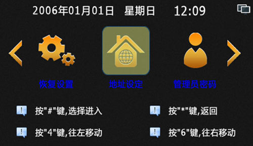 1) 進(jìn)入系統(tǒng)設(shè)置:主界面輸入“#”+6位管理員密碼+“#”(出廠默認(rèn)管理員密碼為666666),進(jìn)入系統(tǒng)設(shè)置界面,“*”鍵退出或清楚錯(cuò)誤輸入功能,“#”鍵為確定功能,“4”和“6”左右移動(dòng)選擇,進(jìn)入時(shí)默認(rèn)為地址設(shè)定,如圖4.1.1: