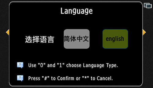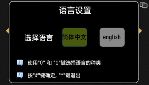 1) 設(shè)置機(jī)器的語(yǔ)言,默認(rèn)為中文顯示,按“0”選擇中文,按“1”選擇英文,“*”鍵退出,“#”保存并退出,中文和英文顯示如圖4.9.1和4.9.2: