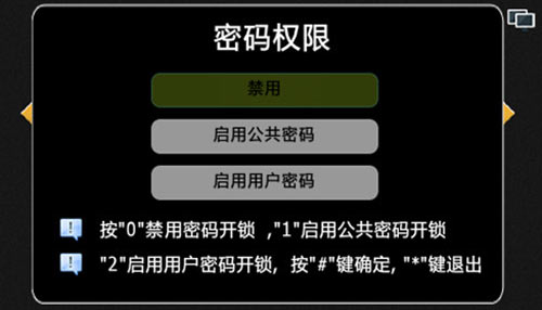1) 設(shè)備出廠默認(rèn)開(kāi)鎖為禁用,按照界面提示,“0”選擇禁用,系統(tǒng)將無(wú)法使用開(kāi)鎖密碼來(lái)開(kāi)啟門鎖;“1”啟用公共密碼開(kāi)鎖,用戶可通過(guò)公共開(kāi)鎖密碼開(kāi)啟門鎖;“2”啟用用戶密碼開(kāi)鎖,用戶可通話用戶開(kāi)鎖密碼開(kāi)啟門鎖。“*”鍵退出,“#”鍵確認(rèn),設(shè)置界面如圖4.5.1: