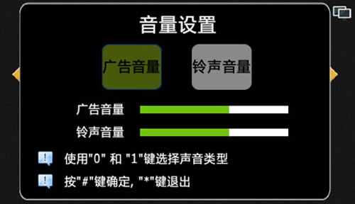 1)可設(shè)置廣告音量和鈴聲音量,按“0”選擇廣告音量選項(xiàng),按“1”選擇鈴聲音量選項(xiàng),按“4”減小音量,按“6”增加音量,如圖4.6.1: