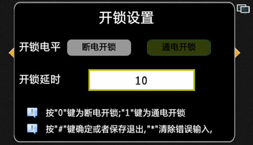 1) 設(shè)置電控鎖的開(kāi)鎖方式以及開(kāi)鎖延時(shí),默認(rèn)為通電開(kāi)鎖,延時(shí)為10秒,。按“0”選擇斷電開(kāi)鎖,按“1”選擇通電開(kāi)鎖,按“#”進(jìn)入開(kāi)鎖延時(shí)選項(xiàng),輸入延時(shí)后按“#”鍵保存(延時(shí)范圍為1-150秒),按“*”鍵可清除錯(cuò)誤輸入或退出開(kāi)鎖設(shè)置界面,如圖4.7.1: