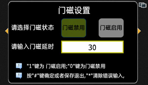 1) 設(shè)置門磁的啟用和禁用狀態(tài),以及門磁的延時(shí)。默認(rèn)門磁為禁用,延時(shí)為30秒,按“0”選擇門磁禁用,按“1”選擇門磁啟用,“*”鍵清除延時(shí)時(shí)間或退出門磁設(shè)置界面,“#”鍵保存設(shè)置并退出,如圖4.8.1: