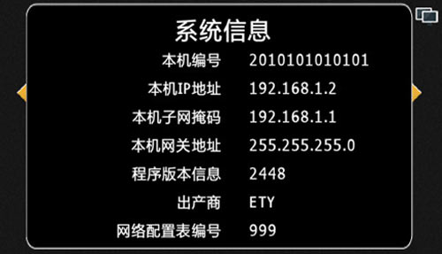 1) 可查看當(dāng)前設(shè)置的系統(tǒng)信息,包括房號(hào),IP地址,子網(wǎng)掩碼,網(wǎng)關(guān)地址,程序版本,出場(chǎng)商,網(wǎng)絡(luò)配置表型號(hào),按“*”鍵退出查看界面,界面如圖4.11.1: