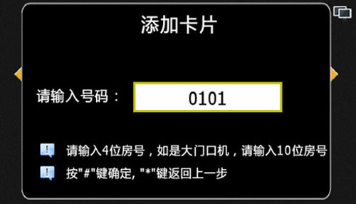 2) 添加IC卡操作:輸入需要添加IC卡的房號(hào),如果是在單元機(jī)上,輸入4位例如0101,如果是在圍墻機(jī)上,輸入10位房號(hào)例如0102010101(1區(qū)2棟1單元101戶),按“#”鍵確認(rèn),如圖4.12.2: