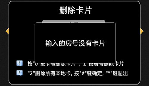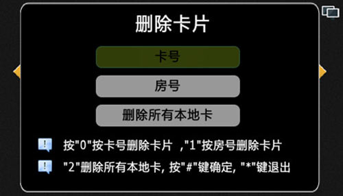 4) 按“1”選擇刪除卡片,進(jìn)入下一級(jí)菜單,如圖4.12.4,按“0”按照卡號(hào)來(lái)刪除卡片,按“1”按照房號(hào)來(lái)刪除卡片,按“2”刪除所有本地發(fā)出的卡片。