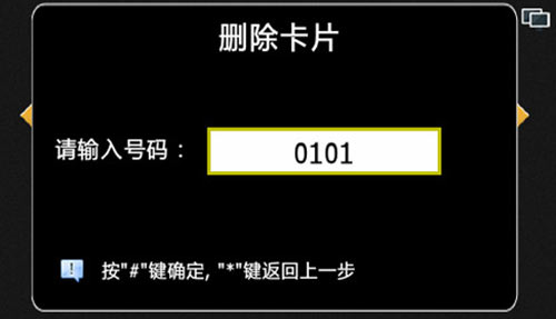 按“1”+“#”選擇房號(hào)后,輸入需要?jiǎng)h除所有卡對(duì)應(yīng)的房號(hào),如果在單元機(jī)上需輸入4位房號(hào),例如0101,如圖4.12.6,如果在圍墻機(jī)上需輸入10位房號(hào),例如0102010101。若該房號(hào)存在IC卡,則刪除該房號(hào)的所有住戶IC卡;若輸入的房號(hào)沒(méi)有卡片,則提示輸入的房號(hào)沒(méi)有卡片,如圖4.12.7: