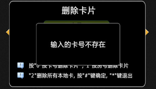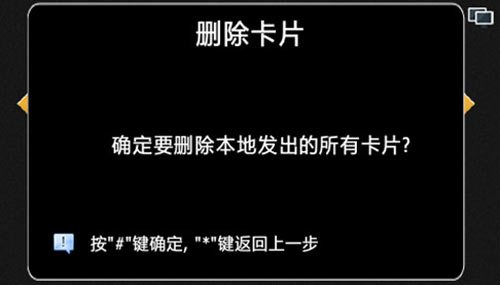 按“2”+“#”選擇刪除所有本地發(fā)出的卡片,提示確認(rèn)要?jiǎng)h除本地發(fā)出的所有卡片,按“#”鍵確認(rèn)刪除,按“*”鍵返回上一步,如圖4.12.8: