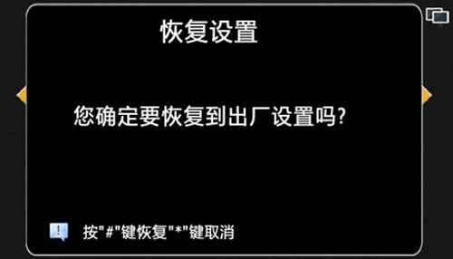 1) 點(diǎn)擊恢復(fù)設(shè)置按鈕,選擇是否恢復(fù)到出廠設(shè)置,按“#”確定恢復(fù)出廠,按“*”取消恢復(fù)出廠,如圖4.13.1: