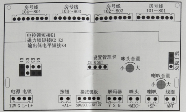 安裝施工調(diào)試時(shí),安裝工作人只可以根據(jù)現(xiàn)場(chǎng)環(huán)境的需要進(jìn)行一些調(diào)整, 比如:通話(huà)聲音過(guò)大或過(guò)小,可以稍微調(diào)整“咪頭音量”的電位器(如圖5所示),一般不用調(diào)整。 設(shè)備受施工場(chǎng)所、環(huán)境、線(xiàn)材質(zhì)量等因素的影響,主機(jī)或分機(jī)可能會(huì)出現(xiàn)嘯叫吉。如果出現(xiàn)此類(lèi)情況,安裝工作人員可以通過(guò)調(diào)整“咪頭音量” 和“喇叭音量” 的電位器(如圖5所示)。